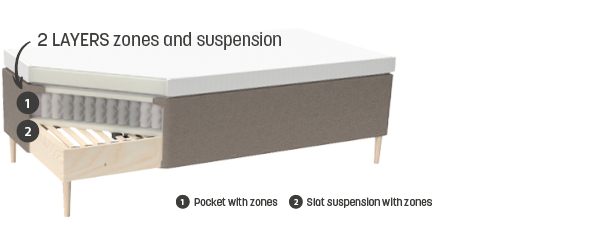 With zoned pocket springs in the mattress, and a bottom frame with zoned slat suspension, the shoulder zone gets extra depth while the hip zone provides better support for the heavier hip.