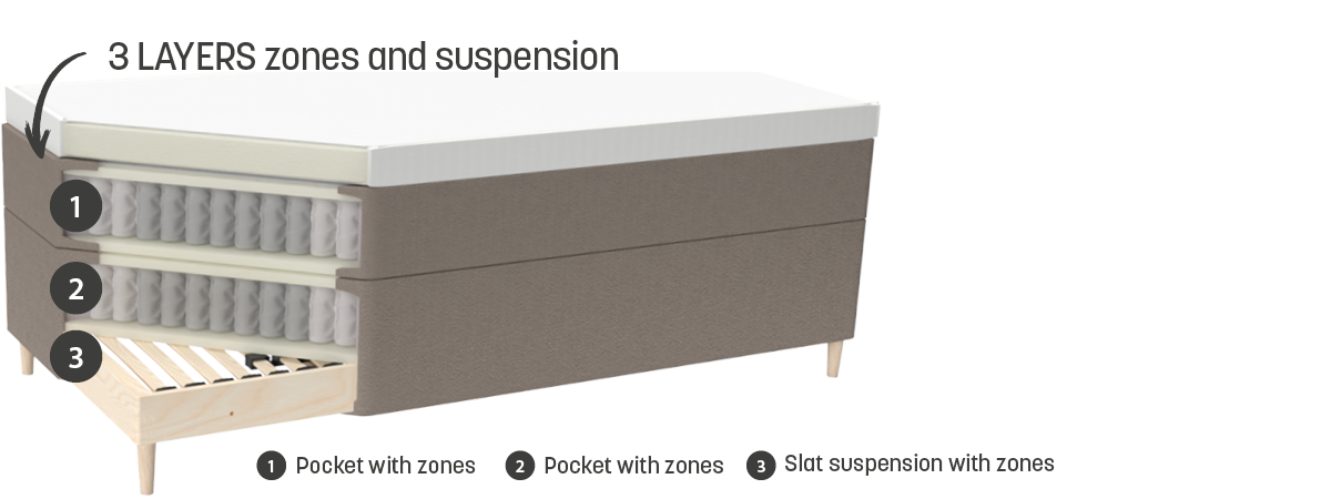 Exclusive to Wonderland, the triple-layer zone and suspension system combines zoned pocket springs in both mattresses with zoned slat suspension underneath. This enhances the softness of the shoulder zone and adds exceptional support for the hips.